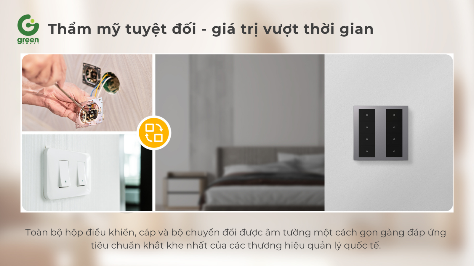 Thiết kế liền mạch: Toàn bộ hộp điều khiển, cáp và bộ chuyển đổi được âm tường một cách gọn gàng, không để lộ bất kỳ thiết bị nào kém thẩm mỹ. Điều này bảo toàn sự sang trọng, tinh tế, đáp ứng tiêu chuẩn khắt khe nhất của các thương hiệu quản lý quốc tế.