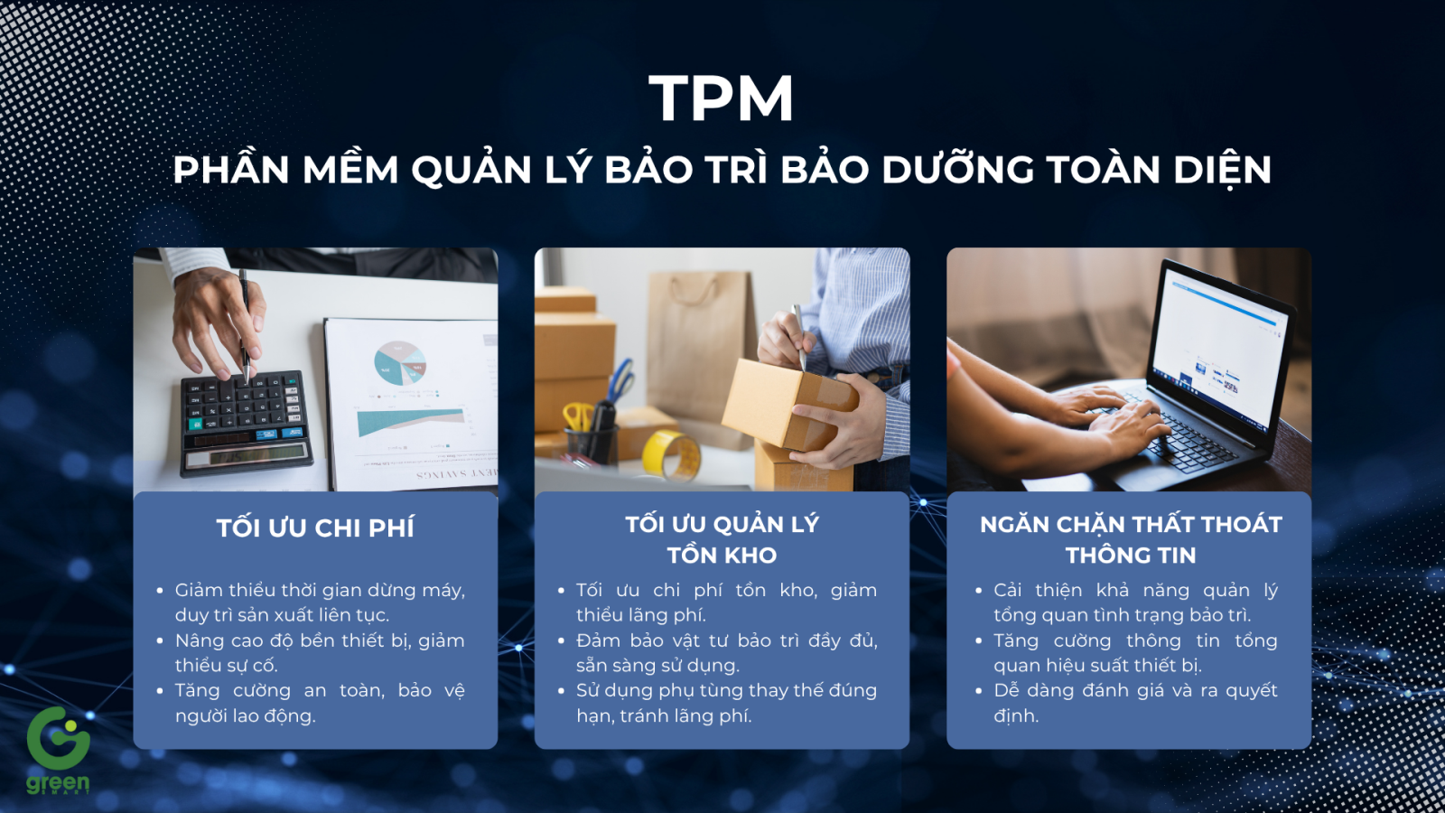 TPM - Phần mềm Quản lý Bảo trì bảo dưỡng toàn diện có mặt trên thị thường không chỉ là một công cụ phục vụ, TPM - giải pháp giải pháp toàn diện mang lại những lợi ích đột phá với ba lợi ích cốt lõi: