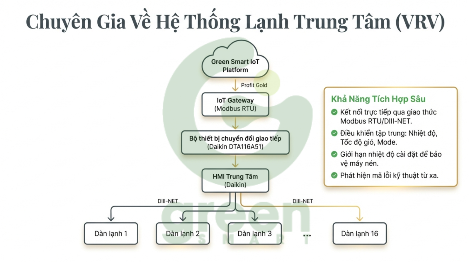 Khác biệt của Green Smart nằm ở khả năng tích hợp sâu với hệ thống lạnh trung tâm VRV/VRF (Daikin, Mitsubishi...). Việc giới hạn nhiệt độ cài đặt và kiểm soát tải thông minh giúp bảo vệ máy nén, kéo dài tuổi thọ thiết bị thêm 25%. Hệ thống chuyển đổi tư duy từ bảo trì khắc phục sang bảo trì dự báo thông qua cảnh báo sớm trên phần mềm CENTAURA.