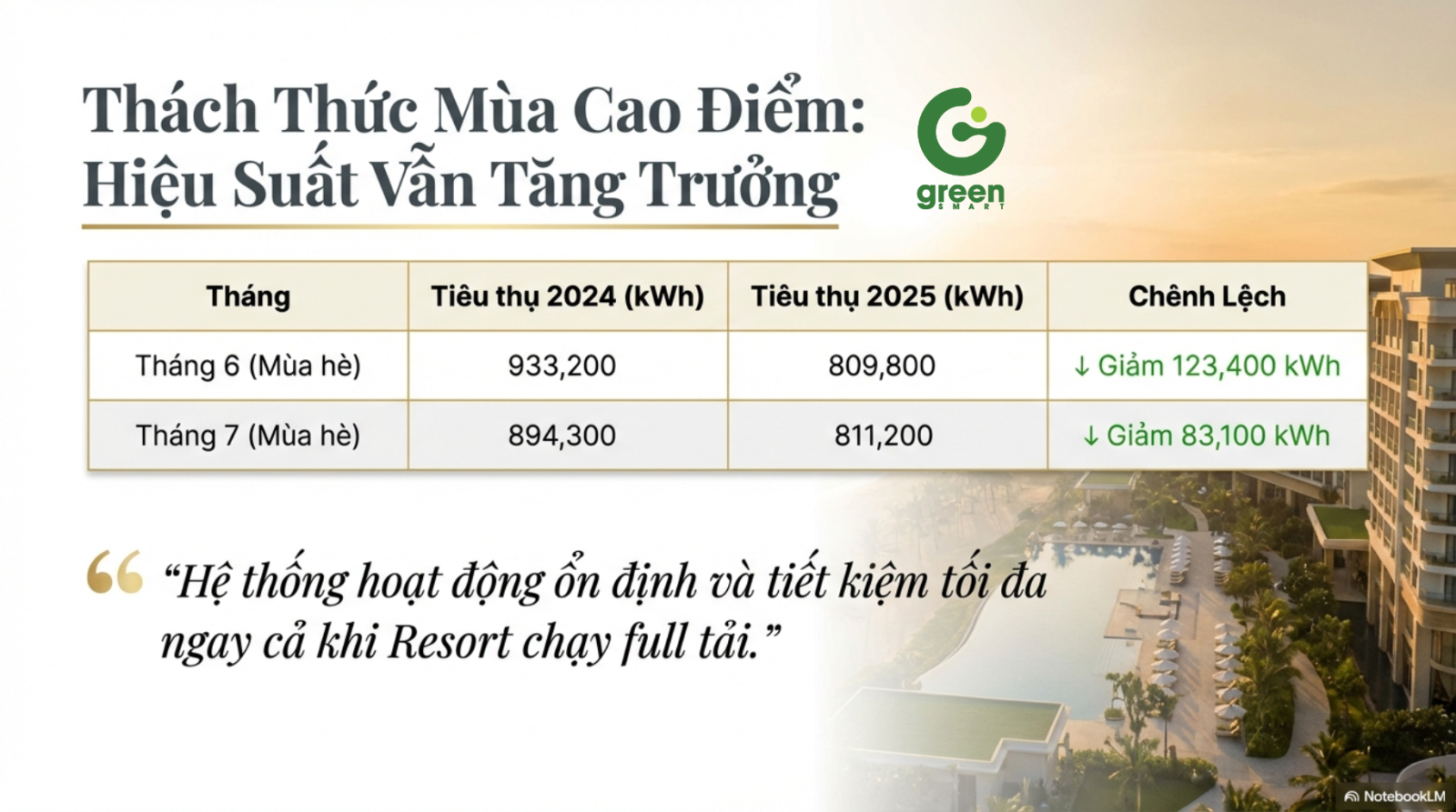 Sức mạnh của giải pháp Green Smart được minh chứng rõ nhất qua dự án Centara Mirage Mũi Né – resort với quy mô hơn 900 phòng và các cụm Villa diện tích lớn. Bằng cách triển khai hệ thống quản lý năng lượng chuyên sâu, kết quả đạt được sau một năm (so sánh dữ liệu 2024 và 2025) là vô cùng ấn tượng: