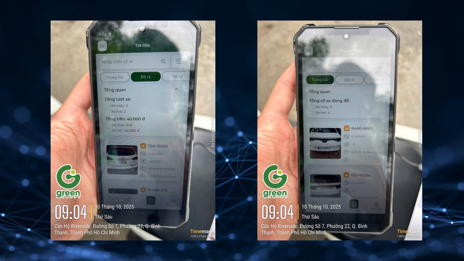 Real-world images of the Green Smart Tic & Go handheld parking system solution implemented at the Riverside project (Green Smart)