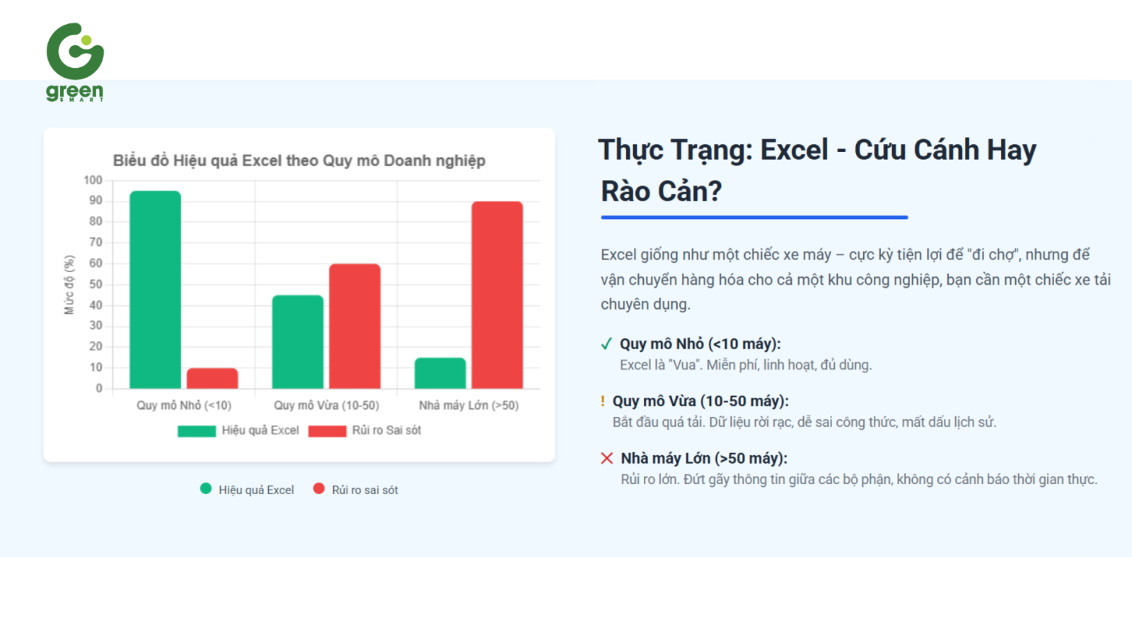 Đối với nhà máy lớn: Excel chỉ nên là công cụ để "tổng hợp báo cáo" cho ban lãnh đạo. Việc dùng Excel để vận hành thực tế tại hiện trường là một rủi ro lớn, dễ gây ra sự đứt gãy thông tin giữa các bộ phận.